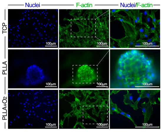 Morphology of hASCs on PLLA and on PLLA+O2 cultures. Representative fluorescence images of nuclei (DAPI, blue) and F-actin (Phalloidin-FITC, green) in hASCs on TCP, on PLLA, and on PLLA+O2. High magnification of selected dashed squares (merged DAPI-Phalloidin) is reported in the right panel.