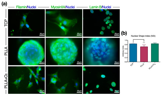 Finally, we monitored the expression of Lamin-B, one of the nucleoskeleton proteins connecting the cytoskeleton proteins and the nucleus [34,35]. Lamin-B expression followed the change of the nuclear shape as a consequence of the spheroid organization on pristine PLLA. On the contrary, Lamin-B designed a canonical nuclear shape in ASCs on PLLA+O2 and on TCP (Figure 4a).