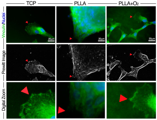 Distribution of Vinculin Focal Adhesion Spots in hASCs on PLLA and on PLLA+O2. Immunofluorescence representative images show the expression of Vinculin (green) and VFASs (red arrow) and the related Prewitt images elaboration by MATLAB software. Image magnification: 60×. Digital zoom 3× from the original 60× images.