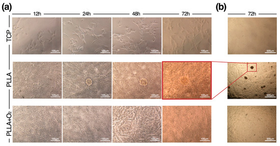 Time-to-time formation of hASC spheroids on PLLA. (a) Representative brightfield images by an Eclipse-TS100 microscope equipped with a Nikon camera (Nikon, Tokyo, Japan), show the spheroids’ organization of hASCs during the culture period on PLLA films and their canonical fibroblasts-like morphology on PLLA+O2 film and on TCP; and (b) representative overview of hASCs on TCP, on PLLA, and on PLLA+O2 films.