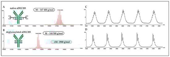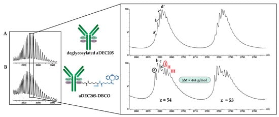 200 µg of each DEC205 antibody sample in PBS (aDEC205 native, aDEC205-dg (Section 2.5.2) and aDEC205-DBCO (Section 2.5.3)) was prepared by centrifugation-dialysis (Amicon Ultra Centrifugal Filters, 0.5 mL, MWCO 100K) using 0.2% formic acid in water. This desalting process was repeated 15 times, each with 250 µL of 0.2% formic acid in water. Each antibody sample was recovered in a total volume of 50 µL. Prior to the measurement, a solution of acetonitrile/water with 0.1% formic acid was added to the antibody samples (1:1 vol.) and mixed by sonication for 5 min. The samples were infused at a flow rate of 5 µL/min by a syringe pump (Legato 180 from Kd Scientific, Holliston, MA, USA).