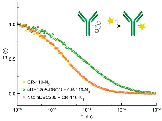 In general, fluorescence correlation spectroscopy (FCS) was proven to be the ideal method to characterize SPAAC reactions of (bio)macromolecules with small amounts of reactive groups by detecting the increase in size of the respective fluorescent species resulting from the performed conjugation reaction.