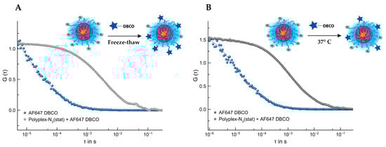 The previous performed SPPAC reaction of polyplexes, consisting of cationic block copolymers and sensitive pDNA, with fluorescent dyes (Section 3.4.3 and Figure 6A) by the freeze-thaw process, has not shown any influence on the polyplex structure, like aggregation or polyplex deformation, visualized by FCS measurements. Therefore, the following SPAAC of azide-functionalized polyplexes, derived from P(Lys)-b-P(HPMA)-N3(stat) block copolymer and AF647-labeled aDEC-DBCO was also performed via the freeze-thaw protocol.
