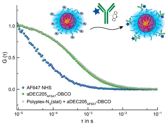 Now, using an excess of 100 equivalents of AF647-labeled aDEC205-DBCO in the SPAAC with an azide-functionalized polyplex, a fluorescent species in the polyplex size range of Rh = 52 nm (Figure 7, grey line) could be detected via FCS confirming a successful SPAAC, at least for a certain extent. The FCS correlation curves of aDEC205AF647-DBCO (green line) and of the polyplex-antibody conjugate (grey line) show an almost identical shape, although they originate from solutions containing species with different hydrodynamic radii: Rh = 5.5 nm for aDEC205AF647-DBCO compared to Rh = 52 nm for the polyplex-antibody conjugate. This is a result of the low fraction of only 5% for the polyplex-antibody species in the reaction mixture and is directly caused by the high excess of unremoved DBCO-modified aDEC205, which was necessary to force the conversion between both macromolecules in this SPAAC.
