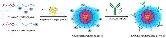 (A) Polyplex formation of P(Lys)-b-P(HPMA)-N3(stat) or P(Lys)-b-P(HPMA)-N3(end) block copolymers with pDNA. (B) Strain-promoted alkyne-azide cycloaddition (SPAAC) of azide-functionalized polyplex and DBCO-modified aDEC205.