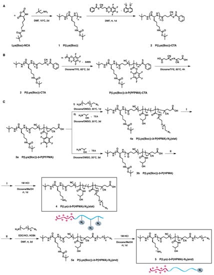 (A) Synthesis of P(Lys(Boc)) (1) by ring-opening polymerization of Lys(Boc)-NCA and formation of macromolecular chain transfer agent P(Lys(Boc))-CTA (2). (B) RAFT polymerization of PFPMA leading to P(Lys(Boc))-b-P(PFPMA) precursor block copolymer (3a). (C) Various post-polymerization reactions leading to P(Lys)-b-P(HPMA)-N3(stat) (4) and P(Lys)-b-P(HPMA)-N3(end) (5).