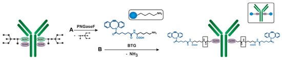 From the perspective of antibody modification, conventional chemical modification strategies for the incorporation of bioorthogonal functionalities, linker molecules or even drug molecules are difficult to control in number and conjugation site [,]. This leads to heterogeneous conjugates with different stoichiometries, which may vary in their pharmacokinetic properties [,]. To overcome these limitations, we used a site-specific enzymatic modification developed for IgG antibodies, resulting in homogenous conjugates with two functional units at two defined amino acid positions []. In a two-step enzymatic synthesis using peptide-N-glycosidase F (PNGase F) for a preceding deglycosylation, two lysine-surrogates can be connected to each glutamine residue (Q295) in the heavy chain of the antibody via the enzyme bacterial transglutaminase (BTG).
