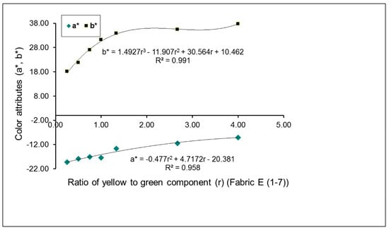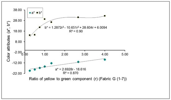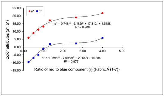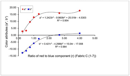 As indicated in the previous studies, there are linear or non-linear mathematical relationships between the mixed color attributes of fabric and the proportion of yarn color components on the fabric surface [,]. From Figure 2, Figure 3, Figure 4 and Figure 5, it is easy to see that most combinations of red-blue and green-yellow have non-linear relationships between the mixed color attributes (a* and b*) of fabrics and the ratio of two yarn color components, for the surface color mixing of fabrics A (1–7), C (1–7), E (1–7) and G (1–7), while the a* value of fabric G (1–7) presents a linear relationship with the ratio of yellow to green components of yarns.