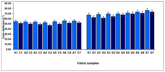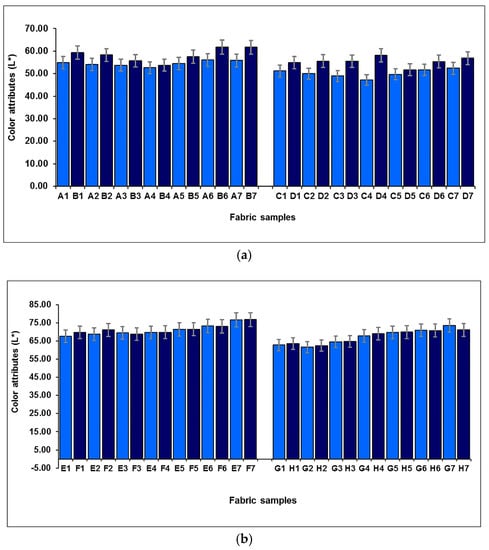The comparisons of lightness for each pair of higher and lower density fabrics, in blue-red and yellow-green mixing, are shown in Figure 10a,b, respectively. Pictures of some fabric samples are displayed in Table 4, including C2/D2 and C6/D6. It can be seen that both fabrics, with and without the regulating layers in a lower weft density, exhibit higher values in lightness compared to the corresponding fabrics in a higher density. One possible reason is that the lower density fabric has longer white warp floats on the fabric surface than that of the higher density fabric. In addition, more warp floats may appear from the space of face wefts, which are in the middle or back layer of fabrics, with and without the regulating layers, respectively. The average lightness differences (ΔL*) between higher and lower blue-red mixed fabrics, without and with regulating layers, reach 3.77 and 5.25, respectively, while the values of ΔL* of yellow-green mixed fabrics (E1/F1 to E7/F7) and (G1/H1 to G7/H7) are 0.84 and 0.83, respectively. The yellow-green mixed fabric shows a lower lightness difference than that of the blue-red mixed fabric. This could be explained by the yellow and green wefts possessing much higher lightness than that of the blue and red weft yarns; thus, the change in white warp floats on yellow-green mixed fabrics due to the weft yarn density does not bring a more significant effect on the fabric lightness, compared to the blue-red mixed fabrics.