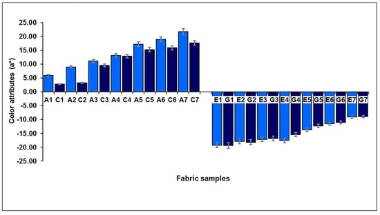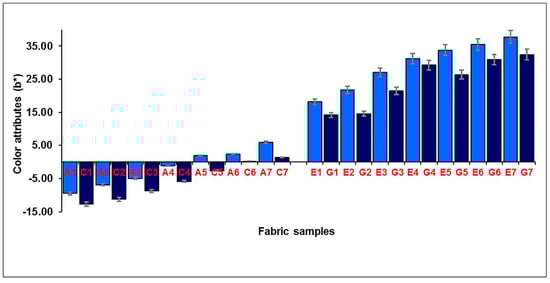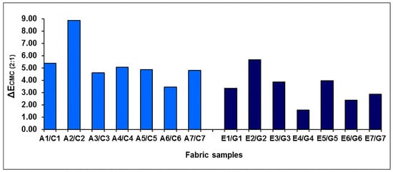 The effect of the weft-backed structure on the redness and greenness (a*), and blueness and yellowness (b*), of blue-red and yellow-green mixed fabrics is presented in Figure 7 and Figure 8, respectively. From Figure 7 and Figure 8, it is easy to see that the blue-red mixed fabrics with regulating layers (C1 to C7) have lower redness, but higher blueness, compared to the fabrics without regulating layers (A1 to A7). The average differences in redness-greenness (Δa*) and blueness-yellowness (Δb*) of blue-red mixed fabrics (A1/C1 to A7/C7) are 2.81 and 3.92, respectively. After adding a middle-regulating layer into the structure, the yellow-green mixed fabrics with regulating layers (G1 to G7) exhibit slightly lower greenness and much lower yellowness than that of fabrics without regulating layers (E1 to E7). The average differences—Δa* and Δb*—of yellow-green mixed fabrics (E1/G1 to E7/G7) reach 0.69 and 5.14, respectively. The total color difference, ∆ECMC(2:1), resulting from ∆L*, ∆a* and ∆b*, is from 3.47 to 8.87 with an average value of 5.31 for blue-red mixed fabrics (A1/C1 to A7/C7), and is within the range of 1.59 to 5.67 with an average value of 3.39 for yellow-green mixed fabrics (E1/G1 to E7/G7), as shown in Figure 9, indicating a significant color difference between fabrics, with and without regulating layers, based on the industrial standard for the tolerances of color difference.