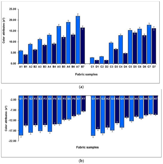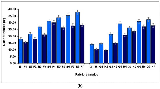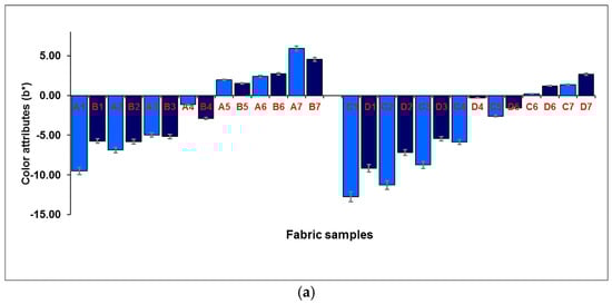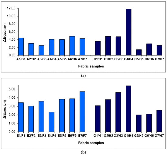 Figure 11 shows the comparison of each pair of higher and lower density fabrics in terms of the redness and greenness (a*). As shown in Figure 11, the higher density fabrics exhibit higher redness in the blue-red mixed fabrics and higher greenness in the yellow-green fabrics than that of the corresponding lower density fabrics. In terms of blueness and yellowness (b*), the blue-red mixed fabrics with higher densities show high blueness fabric samples A3/B3, A4/B4, A5/B5 and A7/B7, while the yellow-green fabrics with higher densities exhibit higher yellowness compared to the lower density fabrics, as shown in Figure 12. The average redness-greenness differences (Δa*) between higher and lower density blue-red fabrics, without and with regulating layers, are 3.85 and 2.78, respectively, while the values reach 2.87 and 2.63 for higher and lower density yellow-green fabrics, respectively. The higher and lower density blue-red fabrics show average blueness-yellowness differences (Δb*) of 1.28 and 2.83, with or without a regulating layer, respectively, and the values of Δb* for yellow-green fabrics, without and with the regulating layers, are 5.28 and 4.90, respectively. The total color difference between fabric samples in fabrics with a lower or higher weft density, ∆ECMC(2:1), can be calculated from ∆L*, ∆a* and ∆b*, which is shown in Figure 13. For the blue-red mixed fabrics, the value of ∆ECMC(2:1) for each pair of fabrics is from 2.51 to 4.89 for samples without the regulating layer, and from 1.49 to 11.82 for fabrics with the regulating layer. After adjusting the weft yarn density for yellow-green fabrics, seven pairs of fabrics without the regulating layers exhibit color differences according to the representative values of ∆ECMC(2:1), from 2.34 to 4.72, while the samples with regulating layers present color difference values within the range of 1.99 to 5.41, as shown in Figure 13b. From the view of industrial standards for tolerances in color difference, such results indicate that the weft density has a significant effect on color attributes for the two selected weft densities in this experiment.