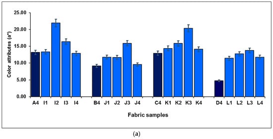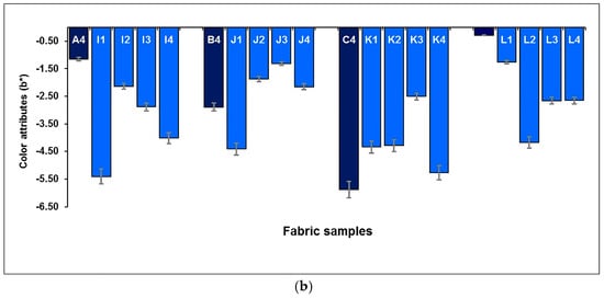 Figure 14 shows the mixing component of black yarn on the lightness of blue-red mixed fabrics. It is easy to see that for both blue-red mixed fabrics, without and with regulating layers, or in lower and higher weft densities, the lightness of fabric presents a decreasing trend after adding the mixing component of black yarn. The effects of mixing black yarn on the redness-greenness and blueness-yellowness of blue-red mixed fabrics are shown in Figure 15a,b, respectively. For blue-red mixed fabrics, without and with regulating layers (I1–4, J1–4, K1–4 and L1–4), the redness-greenness (a*) increased and then decreased with the increase in black weft floats, when more black weft floats were introduced. In terms of fabric blueness-yellowness (b*), the introduction of black weft floats increased the blueness of the fabric, except for samples K1–4, but a further increase in the proportion of black yarn resulted in a decrease then increase in fabric blueness for samples I1–4, J1–4 and K1–4, as shown in Figure 15b.