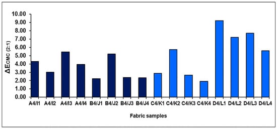 The color difference, ∆ECMC(2:1), of each pair of fabric samples is shown in Figure 16, which can be calculated from ∆L*, ∆a* and ∆b*. As shown in Figure 16, ∆ECMC(2:1) is from 3.03 to 5.45, with an average value of 4.19, and from 2.24 to 5.19 with an average value of 3.03, for blue-red mixed fabrics without a regulating layer in a higher weft density (A4/I1 to A4/I4) and lower weft density (B4/J1 to B4/J4), respectively. It can also be seen that the average value of the color difference reaches 3.29 and 7.43 for the blue-red mixed fabrics with the regulating layer in the higher weft density (C4/K1 to C4/K4) and lower weft density (D4/L1 to D4/L4), respectively. The results indicate that fabric has a significant color difference after the black yarn is introduced.