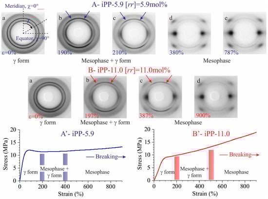 Stress strain curves (A’,B’) and bidimensional WAXS patterns of the sample iPP-5.9 (A) and iPP-11.0 (B) at the indicated deformations. The critical values of deformation marking the beginning (εstart), and the complete (εend) transformation of the initial γ form into mesophase are indicated by the vertical bold lines in (A’,B’). The stretching direction is vertical. Arrows in b and c indicate the polarization of the (008)γ reflection of γ form, off the equator (horizontal direction) and off the meridian (vertical direction), defined in the image a of part A of the figure, occurring at low deformations, due to orientation of the crystals of the γ form with chain axes nearly perpendicular to the stretching direction (vide infra). The azimuthal angle χ is defined in the image a of part A.