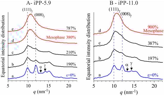 The stress-strain curves and representative WAXS images collected in situ during stretching of compression-moulded specimens of the samples iPP-5.9 and iPP-11.0 are shown in Figure 1. The equatorial profiles extracted from the bidimensional WAXS images collected at relevant deformations are reported in Figure 2. The initial compression-moulded samples are crystallized from the melt in the γ form almost completely (patterns a of Figure 1) [19,20].
