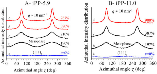 Azimuthal profiles of intensity centered in the q region around 10 nm−1, extracted from the bidimensional WAXS images of Figure 1 for the samples iPP-5.9 (A) and iPP-11.0 (B).
