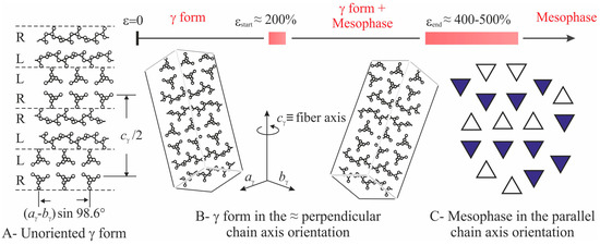 The intensity at q ≈ 12 nm−1 relative to the (008)γ reflections of γ form (curves a of Figure 2), instead, at low deformations is polarized on a layer line off the equator (horizontal direction) and off the meridian (vertical direction), as indicated by the arrows in the images b, c of Figure 1, and only when the transformation into the mesophase is complete, that is, at deformations higher than εend, the intensity at q ≈ 12 nm−1 becomes polarized on the equator [19,20]. This indicates that part of the crystals of the initial γ form tend to become oriented at low deformations with the chain axes nearly perpendicular to the stretching direction, as shown in Figure 4, instead than parallel as in the standard fiber morphology [16,38]. It is worth noting that for the perpendicular chain axis orientation of γ form, the polarization of the (111)γ (at q ≈ 10 nm−1) reflection occurs on the equator [39].