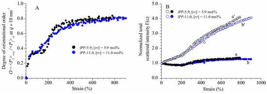 The evolution of orientational order O with deformation (Figure 5A) of the two samples follows a common trend involving different steps. For deformations ε lower than 100%, a steep increment of the orientational order occurs, due to orientation of the crystals in the γ form with chains axes perpendicular to stretching direction. In the deformation range between 100 and ≈150–200%, the values of O reach a quasi-plateau of 0.30–0.4. This indicates that at low deformations, changes in azimuthal intensity distribution of (111)γ reflections of γ forms essentially probe small reorientation of the lamellar crystals along the pathway toward the fibrillary morphology, due to lamellar rotations [26,27,40]. The leading deformation mechanisms in the first plateau region, instead, correspond to interlamellar shear, that is slip of the crystalline lamellae parallel to each other, and/or interlamellar separation [26,27,28,41,42]. At this stage, no phase transitions occur and all movements are assisted by the shear deformation of the compliant interlamellar amorphous phase. Successively, starting from deformations close to the critical strain at which transformation into mesophase starts (εstart ≈ 200%, Figure 1 and Figure 4), the orientational order O increases again up to reach a final plateau value of ≈0.8 at high deformations (Figure 5A). This indicates that after lamellar breaking, further deformation induces collective shear process, up to reach destruction of the preexisting crystals (mechanical melting) and successive recrystallization with formation of fibrils including mesomorphic aggregates [24,25].