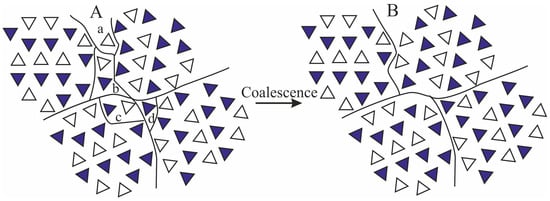 Moreover, considering that the mesophase originates from the breaking of crystals of γ form through a process of mechanical melting and re-crystallization, and that the lamellar crystals of γ form are not characterized by chain folding because of the non-parallel arrangement of the chains (Figure 4A) [47], the size of the coherent domains in a mesomorphic aggregate may easily increase by effect of stretching also in the direction parallel to the chain axes, through incorporation of monomeric units located at the boundaries with the amorphous phase. We calculate that, on average, an increase of the coherent length by a factor of 1.1–1.6 along the three orthogonal directions x, y and z of a domain, leads to an increase of volume by a factor 1.13–1.63 ≈ 1.3–4. As shown in the model of Figure 6, the increase of the coherent length of the mesomorphic domains by incorporation (coalescence) of the isolated sub-domains a-d within the mesomorphic domains, does not necessarily lead to a decrease of the number of domains N2ε. As a consequence, the total scattering intensity increases by effect of deformation, because the product (N2εV2ε) increases due to coalescence phenomena of the kind depicted in Figure 6.