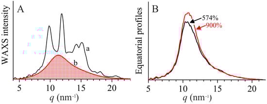 (A) Radially averaged WAXS profile of the undeformed sample iPP-5.9, extracted from the bidimensional WAXS image a of Figure 1A (a) and underlying amorphous contribution, approximated by the diffraction profile of an atactic polypropylene (b). (B) Equatorial profiles extracted from the bidimensional WAXS images of Figure 1B, of the sample iPP-11.0 stretched at 574 and 900% deformations. The diffraction curves are subtracted for the background contribution, approximated as a straight line subtending the whole profiles.