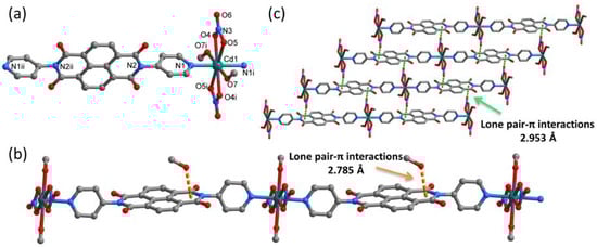 (a) Coordination environment of Cd2+ in 1, symmetry codes: (i) 2 – x, –y, 1 – z; (ii) –x, 2 – y, –z; (b) the lone pair-π interactions between NDI units and methanol; and (c) the lone pair-π interactions extending the one-dimensional chains into a two-dimensional supramolecular network. All hydrogen atoms are omitted for clarity.