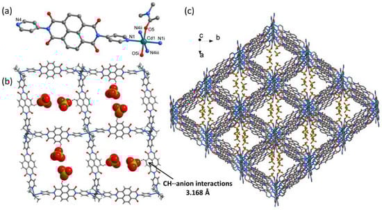 Single-crystal X-ray diffraction analysis reveals that 3 crystallizes in the monoclinic space group C2/c and is composed of an extrodinarily large, cationic square-grid framework carrying two ClO4− anions in each square cavity. The asymmetric unit consists of one half of Cd2+ cation, one DPNDI ligand, one DMA molecule and one ClO4− anion (Figure 3a). It should be pointed out that the diffraction data were treated by the SQUEEZE during the refinement to remove diffuse electron density associated with these largely disordered solvent molecules []. Each octahedral Cd2+ cation is linked by four equatorial DPNDI tectons through the formation of Cd–N bonds (dCd–N = 2.352 Å) and capped by two O atoms from two DMA molecules in axial directions through the formation of Cd–O bonds (dCd–N = 2.301 Å), which leads to a non-interpenetrated and cationic two-dimensional network with square cavities of around 20 Å × 20 Å (Figure 3b). In a given grid, the Cd2+ cations are responsible for the square-grid architecture, the ClO4− anions play important roles in preventing interpenetration of networks by partially occupying the cavities and aligning planar network sheets parallel to each other by participating in CH···anion interactions with core-Hs of DPNDI (dC–O = 3.168 Å) (Figure 3b). Along c axis, the neighboring two-dimensional networks are further bridged by ClO4− anions through another CH···anion interactions to form a three-dimensional framework with one-dimensional channels filled by ClO4− anions and solvent molecules (Figure 3c).