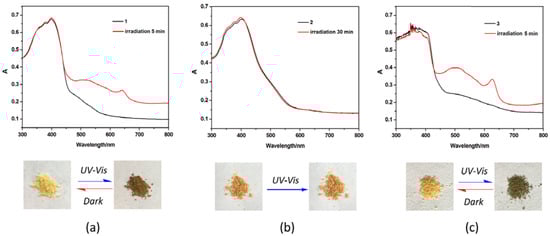 UV−Vis diffuse reflectance spectra of 1–3 before and after irradiation (upper, 1 (a), 2 (b), 3 (c)); photographs showing the photochromic behavior of 1–3 (bottom).