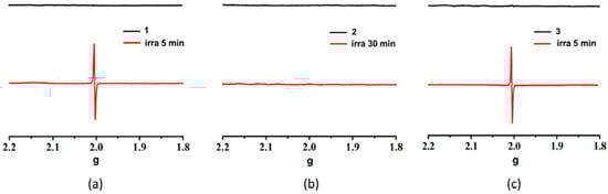 ESR spectra of compounds 1 (a), 2 (b), and 3 (c) before and after irradiation.