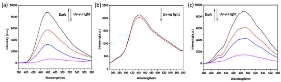 Coordination polymers containing metal centers with the d10 electron configuration have been attracting more interest because of their wide-spread applications in chemical sensors, labeling, and photo-chemistry []. Considering the luminescence performance of DPNDI (Figure S7), the d10 Cd(II) metal ion, and the photochromism of 1 and 3, the photo-controlled luminescence of these compounds were studied in the solid state at room temperature. As shown in Figure 6, compound 1-3 can exhibit blue luminescence with emission maximum at 462, 448, and 495 nm, respectively, upon excitation at 350 nm. For compounds 1 and 3, photocontrolled tunable luminescences are observed under the trigger of ultraviolet visible light. The strength of the emission of 1 and 3 are gradually reduced under ultraviolet visible light irradiation, and the luminescence is almost quenching when the samples change to dark brown after irradiating for six minutes (Figure 4a,c), but their luminescence can be recovered when the samples stand in the dark for several hours. These distinct behaviors indicate that the photocontrolled tunable luminescence of 1 and 3 are reversible, which further demonstrate that there are electron-transfer interactions among the components of the compounds during irradiation, thus resulting in weaker luminescence and even quenching. However, for compound 2, almost no obvious changes are observed even upon irradiation for 30 min (Figure 4b).