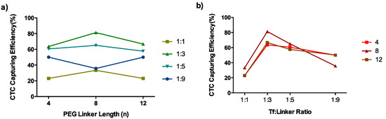 | Sample | Tf-(PEGn-N3)x | Size (nm) b | Tf Amount per MNG (µg mg−1) c | CTC Capturing Efficiency (%) | |