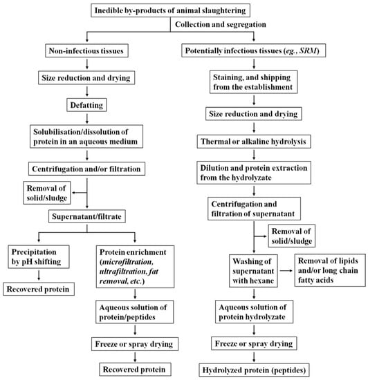 As slaughterhouse waste is likely contaminated with several pathogens, as well as prion proteins, that are capable of infecting both animals and humans, there are potential risks of infectivity associated with certain tissues [22]. Accordingly, segregation and staining of potentially infectious tissues, and deactivation of pathogens and/or prion proteins is necessary to incorporate the protein recovered from such tissues into value-added applications. A review by Franke-Whittle and Insam (2013) on different methods of treating slaughterhouse waste and their effects on inactivation of different pathogens and prion proteins indicates that alkaline hydrolysis is one of the most promising methods for treatment of slaughterhouse waste to deactivate pathogens [22]. Thermal or alkaline hydrolysis is also recommended by the Canadian Food Inspection Agency (CFIA) for deactivation of prion proteins [5,6,21]. Depending on the nature/type of tissues it contains, different approaches/methods can be employed for extraction and recovery of protein. A generalized flow chart for handling and processing of slaughterhouse waste, including potentially hazardous and infectious tissues, for protein recovery is shown in Figure 1.