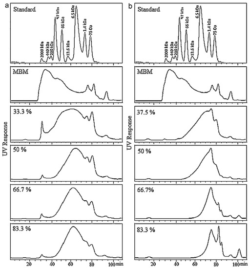 SEC-HPLC of: (a) thermal hydrolyzed SRM in 33.33%, 50.00%, 66.67% and 83.33% water, relative to the total mass; and (b) alkaline hydrolyzed SRM in 37.50%, 50.00%, 66.67% and 83.33% alkaline solution (15%, w/v, NaOH), relative to the total mass. Figure adopted with copyright permission from Elsevier (for Mekonnen et al., 2013).