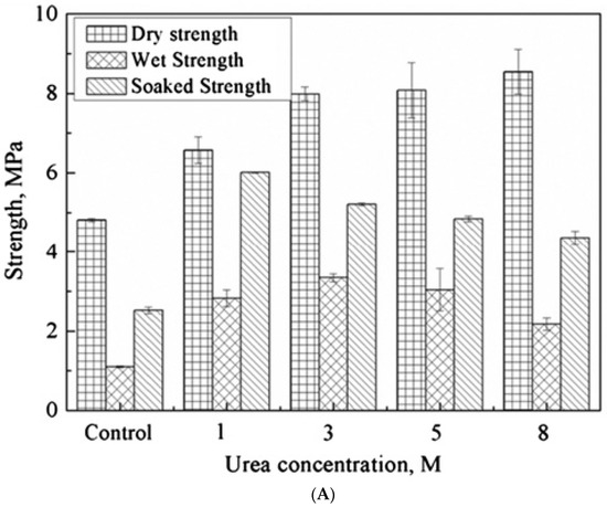 The authors claim that the dry strength of the adhesives resulting from treatment of protein with urea increased with increasing concentrations of urea up to 8 M, but the formulation developed using 3 M urea exhibited the best water resistance (Figure 3A). However, after review of the data, it appears that the dry shear strength of urea treated protein increased for up to 3 M concentration, and then leveled off on further addition of urea, although a definitive cannot be drawn as statistical analysis was not performed. Whilst the formulation developed by treating protein with 1 M urea demonstrated the best soaked shear strength, the wet shear strength was highest for the 3 M urea (and perhaps the 5 M) treated formulation. In the case of SDS treated protein, the 3% SDS formulation demonstrated the best performance under dry and soaked conditions (Figure 3B). The wet shear strength was also best at 3% SDS, though the wet strength of this formulation is perhaps statistically similar to that of the 0.5% and 1% SDS treated formulation.