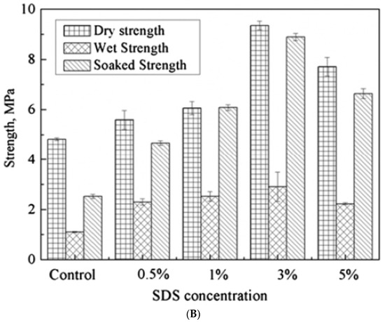With SDS, protein unfolding occurs due to the interactions of the hydrophobic tail of SDS with the hydrophobic side chains of the protein, wherein the polar head of SDS displays electrostatic repulsion with the anionic groups of the protein [73]. Wang and Wu propose that the reduced water resistance at high SDS concentrations was due to the formation of a micelle-like region where hydrophobic groups are buried inside the micelle, thus reducing hydrophobicity of the resulting formulation [40]. However, it is also possible that higher amounts of SDS destroy the secondary structures of proteins and by extension the water resistance property of the final adhesive.
