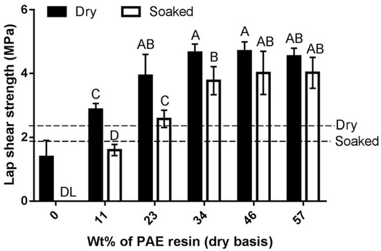 More recently, Lin and Gunasekharan (2016) blended cow blood-based adhesives with acrylic latex-based adhesives and investigated the bond strength and water resistance of the final adhesive system [99]. A blended adhesive led to a notable enhancement of bond strength and water resistance of the resulting wood composite made from hard maple wood under both dry and soaked conditions. For instance, a formulation consisting of 70% cow blood-based adhesive and 30% acrylic latex-based adhesive exhibited 44% enhancement in dry shear strength and 203% enhancement in soaked shear strength as compared to the blood-based adhesive alone. Unfortunately, the authors did not compare the adhesive performance of the blend with that of latex-based adhesive system alone. However, the formulations consisting of 30% and higher amounts of latex-based adhesive demonstrated adhesive strengths and water resistance property similar to that of phenol formaldehyde resins [99]. As latex-based adhesives have high chemical affinity and can easily interact with the functional groups of proteins through non-covalent interactions, it is probable that grafting of blood protein with latex-based adhesives produced physico-chemical crosslinks that resulted in enhanced cohesive strength of the bulk adhesive system and improved bond strength. Moreover, as reported by the authors, the addition of latex-based adhesives to the blood-based adhesive system led to a decreased viscosity [99], which presumably led to enhanced penetration of the final adhesive, thereby resulting in improved mechanical interlocking and enhanced bonding strength. On the other hand, addition of latex gives plasticity to the bondline of protein-based adhesives that reduces the brittleness of the cured adhesive and helps to retain high bond strength [97].