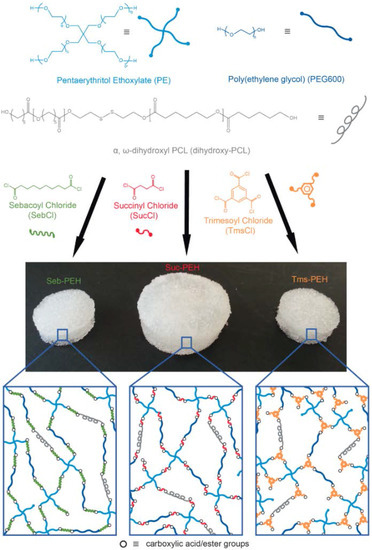The porous polyester-ether hydrogels (PEHs) were fabricated via a facile approach using acid chloride chemistry [36,37], whereby pentaerythritol ethoxylate (PE) and linear poly(ethylene glycol) (PEG600) were cross-linked with either sebacoyl chloride (SebCl), succinyl chloride (SucCl) or trimesoyl chloride (TmsCl). The precursors were dissolved in dichloromethane, combined with various amounts of α,ω-dihydroxyl poly(caprolactone) (PCL), and then allowed to gel in the presence of fused salt-templates (Figure 1). PE, a low molecular weight star polymer composed of four PEG arms, and PEG600 (Mn ~ 600 Da) are inexpensive and commercially available hydroxyl-terminated PEG derivatives. PEG600 was used to decrease the cross-linking density and stiffness of the hydrogels, as well as to slow down the cross-linking reaction so that the hydrogel precursor mixture could easy infiltrate into the template pores prior to gelation. SebCl and SucCl are diacid chlorides derived from naturally occurring carboxylic acids, whereas TmsCl is a triacid chloride derivative of benzene tricarboxylic acid. The cross-linking reaction between the acid chloride groups of SebCl, SucCl, TmsCl, and the hydroxyl end-groups of the PEG derivatives leads to the formation of an ester bonded network and the release of HCl, which is neutralised in subsequent washing steps. For all of the PEHs, the PE: acid chloride: PEG600 mole ratio was kept constant at 1:4:2 in order to provide the same theoretical cross-linking density for all of the hydrogels. This theoretically provides a completely cross-linked network for PEHs prepared with SebCl and SucCl. In the case of the triacid chloride TmsCl there is an excess of acid-chloride groups that during the aqueous washing steps would be hydrolysed to carboxylic acids and could potentially be used for the conjugation of bioactive molecules to modulate cell behaviour as required.