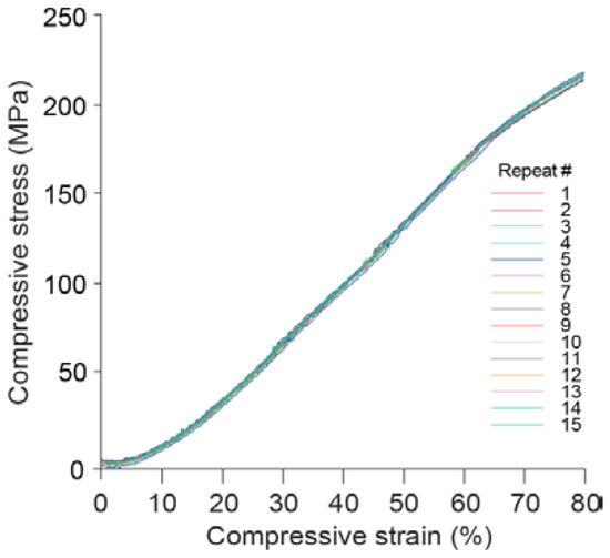 Compressive stress vs strain profile for Seb-PEH2 over 15 compression cycles.