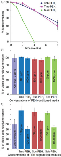 Tissue engineering scaffolds that degrade in a controlled manner, allowing uniform tissue formation as cells regenerate within the porous structure of the scaffold are highly desirable. The advantage of the PEH system is the high density of ester cross-links, which makes them particularly susceptible to hydrolytic and enzymatic cleavage [47,48]. To determine the effect of the cross-linkers on the degradation rate, the Suc-PEH2, Seb-PEH2, and Tms-PEH2 were stored in PBS solution for 8 weeks at 37 °C and the mass loss was calculated at 1, 2, 4 and 8 weeks. The degradation study revealed a mass loss of ~35%–40% in 8 weeks for Tms-PEHs and Seb-PEHs, whereas the Suc-PEHs had completely degraded by 4 weeks (Figure 4a).