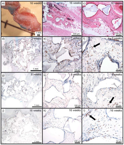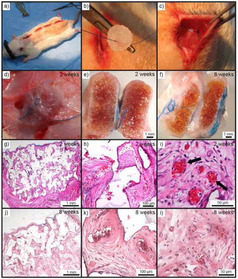 Bisection of the 8 week harvested tissue showed a slight decrease in thickness of the size of the explant and a yellowing of the hydrogel matrix. This reduction in size and yellowing could be indicative of degradative processes. Infiltration of tissue to the centre of the scaffolds was confirmed via H&E staining, but a significant difference in the amount of penetrated tissue was not observed (Figure 5j). Although, it was noted that the tissue present after 8 weeks was of the loose-connective type, rather than the densely cellular tissue present at 2 weeks (Figure 5k,l). Vascularisation of scaffolds is crucial for the growth and survival of regenerating tissue [56,57]. Penetration of vascularised tissue to the centre of the hydrogels demonstrates the interconnected nature of the pores of the PEHs. The tissue developed within the PEH pores must have infiltrated from the surrounding tissue, since no cells were incorporated.