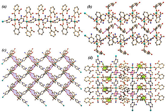 Coordination polymers include a large family of compounds that are formed by central metal ions linked to a variety of ligands by coordination bonds. They have attracted much attention over the last decade due to their fascinating structures and, more importantly, their potential applications in catalysis, gas storage, luminescence, and sensing, among others [1,2,3,4]. Their final solid state structure is driven by a self-assembly process where, depending on the selected building blocks, gives rise to mono-, bi-, or three-dimensional structures. The building blocks of the coordination polymers determine their physical and chemical properties [5,6,7,8].