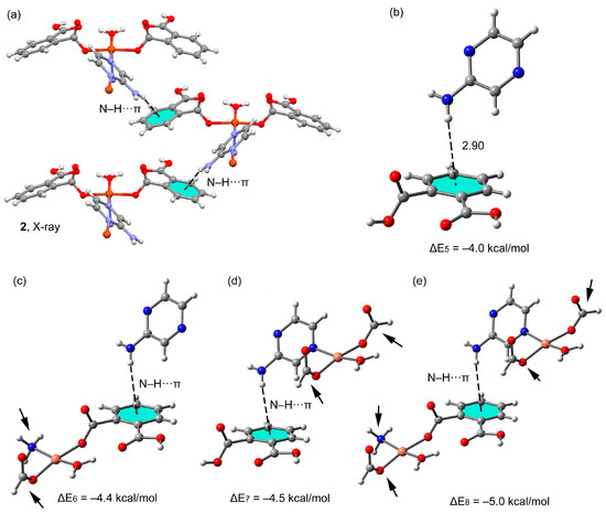 In Figure 5a, we show a fragment of the X-ray structure of compound 1 where the self-assembly of the one-dimensional coordination polymers is highlighted. The antiparallel one-dimensional polymeric chains are connected via the self-complementary N–H···π interactions. Two important factors may influence the strength of the interaction and explain the short distance (2.34 Å). On one hand, the anionic nature of the phthalate ligand that enhances the ability of the π-system as electron donor and, on the other hand, the acidity of the NH group is enhanced by the coordination of the pyrazine to the Co(II) metal center. To verify this hypothesis, we have carried out DFT calculations (BP86-D3/def2-TZVP level of theory) in some model systems and the results are gathered in Figure 5b–e.