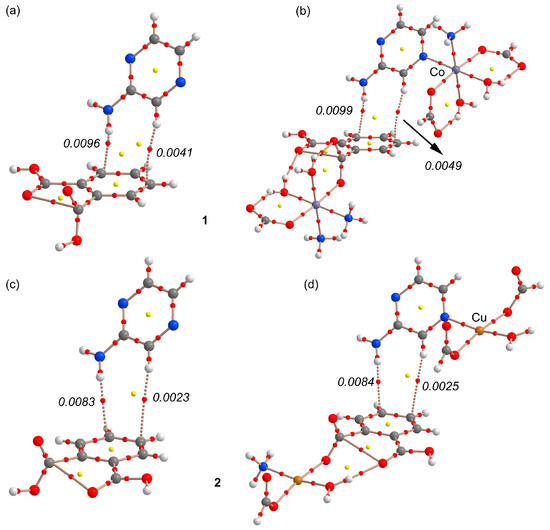 AIM analysis of two compounds 1 (a,b) and 2 (c,d). Red and yellow spheres represent bond and ring critical points, respectively. The bond paths connecting bond critical points are also represented by dashed lines. The values of ρ(r) at the bond CP are given in atomic units (a.u.).