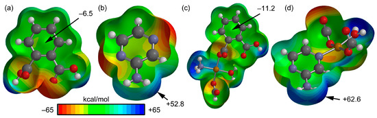 Molecular electrostatic potential (MEP) surfaces computed using the 0.002 a.u. isosurface for (a) phthalic acid, (b) aminopyrazine, (c) phthalate coordinated to Cu(II) and (d) aminopyrazine coordinated to Cu(II). The values of MEP at selected points of the surfaces are given in kcal/mol. The level of theory is B3LYP/6-31+G* and the software used to represent the surfaces is Spartan’10 version 1.1.