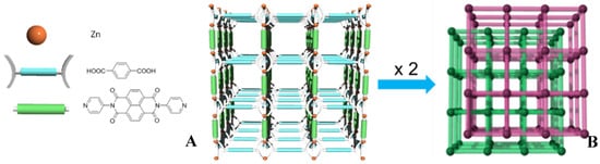 (A) Illustrative representation of one of the two identical frameworks that compose the [Zn2(bdc)2(dpNDI)]n MOF indicating its different components; (B) an schematic representation of the interpenetration of the two identical frameworks.