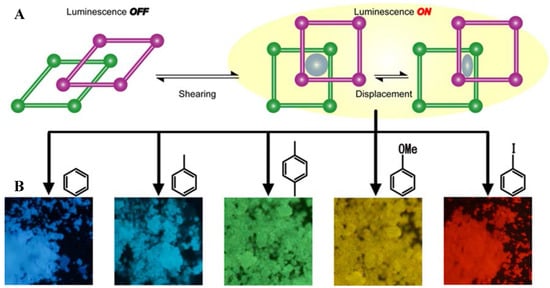 This MOF suffers a structural transformation by the incorporation of aryl guest molecules in its pores as a consequence of specific host-guest interactions (Figure 2). This dynamic guest confinement on the PCP has demonstrated a highly selective molecule sensing able to decode small aromatic guests by the change in the luminescence color visualized by the naked eye under UV illumination [,]. The final host-guest system can render different luminescence colors from blue to cyan, green, yellow or red, because of the confinement of aryl guest species with different substitution pattern into the pores of this photoactive MOF. The different emission colors visualized are the result of the formation of different charge transfer (CT) complexes, which depends mainly on the ionization potential of the aryl guest molecules [,].