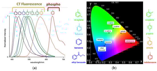 Now, different mixtures of guests were then chosen to promote white light emission from the MOF. First, a combination of ethyl benzoate (blue), para-xylene (green) and iodobenzene (red) was chosen to cover the emission of the three primary colors. Note here that among the guests that activate the emission in the green region of the visible spectra, para-xylene was selected since it promotes the highest fluorescence quantum yield with respect to the other xylene species []. A second combination was attempted by mixing toluene (cyan), anisole (orange) and iodobenzene (red) into the MOF. Iodobenzene was chosen in both cases since it is the only aromatic component that triggers pure red emission.
