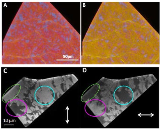 The domains noticed in the MOF crystals show a complementary response to the linearly polarized light (Figure 4C,D). Discrete areas (>1 µm) switch on or off depending on the direction of light-polarization, indicating the existence of macroscopic twinned crystals, as also demonstrated with the crystallographic analysis []. Indeed, by polarized fluorescence microscopy it is easy to recognize the distribution, size and shape of the different twin domains. The detection of those twins would help the structural determination since microscopic twinning cannot be detected without prior suspicion.