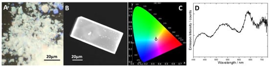 The fluorescent and phosphorescent quantum yields were measured using an absolute photoluminescence quantum yield measurement system equipped with an integrating sphere (C9920-02, Hamamatsu, Japan). Fluorescence color images were recorded with an optical inverted microscope with epi configuration (BX51, Olympus, London, UK) equipped with a color CCD (DP72, Olympus). Samples were excited with UV light by respective Chroma band-pass filters (350/50), and emission was collected with a Chroma cutoff filter (Bellows Falls, VT, USA) from 400 nm. Fluorescence spectra of the particles (powder or single crystals) were recorded by a fiber coupling from Olympus to an Edinburgh Instruments spectrofluorimeter (model FLSP 920, Edinburgh, UK).