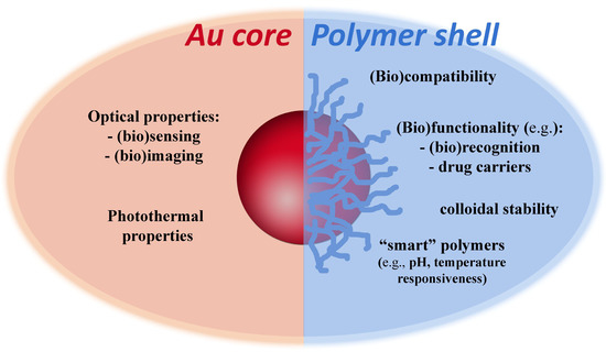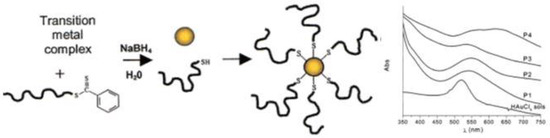 Among the several methods of surface modification and functionalization of Au NPs, those using polymers have received increasing interest in the last few years. This is because polymers offer the possibility to prepare stable, robust and multifunctional shells keeping the optical properties of the Au core, but also the polymeric shell can be responsive to an external stimulus, such as pH or temperature [60,61]. On the other hand, these endeavors require a better control on the polymerization techniques employed to coat the NPs surfaces, which makes RAFT a very attractive strategy.