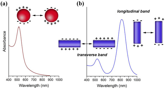 The LSPR of Au NPs is influenced by their size and shape, by the dielectric constant of the surrounding medium and the distance between neighboring nanoparticles [2,6,7,8]. Although for Au nanospheres of bigger sizes and anisotropic particles such as Au nanorods (NRs), the explanation becomes more complex, it suffices to state here that the optical spectra show significative differences. Hence, by increasing the NPs diameter the LSPR shifts to higher wavelengths as shown in Figure 3a [7]. For Au NRs the differences in the optical spectra are even more pronounced, showing an absorption band (transverse mode) corresponding to the electron cloud oscillation along the short axis (diameter), and another band (longitudinal mode) corresponding to the electron cloud oscillation along the long axis (Figure 3b). For the latter, the wavelength for maximum absorption is particularly sensitive to the length of the NRs. Figure 3b shows that by increasing the aspect ratio (AR = length/width) of Au NRs, the longitudinal band shifts to higher wavelengths and can reach the near-infrared (NIR) region, which is of great interest for bioapplications [8,9].